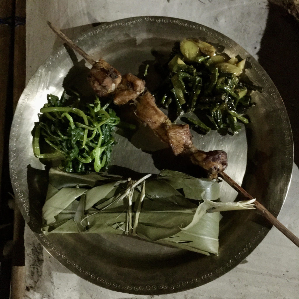 Seated on a lattice bamboo floor around a central fireplace, we huddled around the fireplace to get a better view of our dinner cooking. The lady of the house was adjusting skewers of meat placed around the fire, while slow cooking a fish curry with local leaves on it. She did it all effortlessly, juggling between dishes while also prepping the table for us. Our plate was a beautiful presentation of local food – steamed rice wrapped in banana leaf, meat on skewers and two unique varieties of plant food. If food was the way to the heart, this was it. It was the perfect ending of a perfect first day in Majuli.